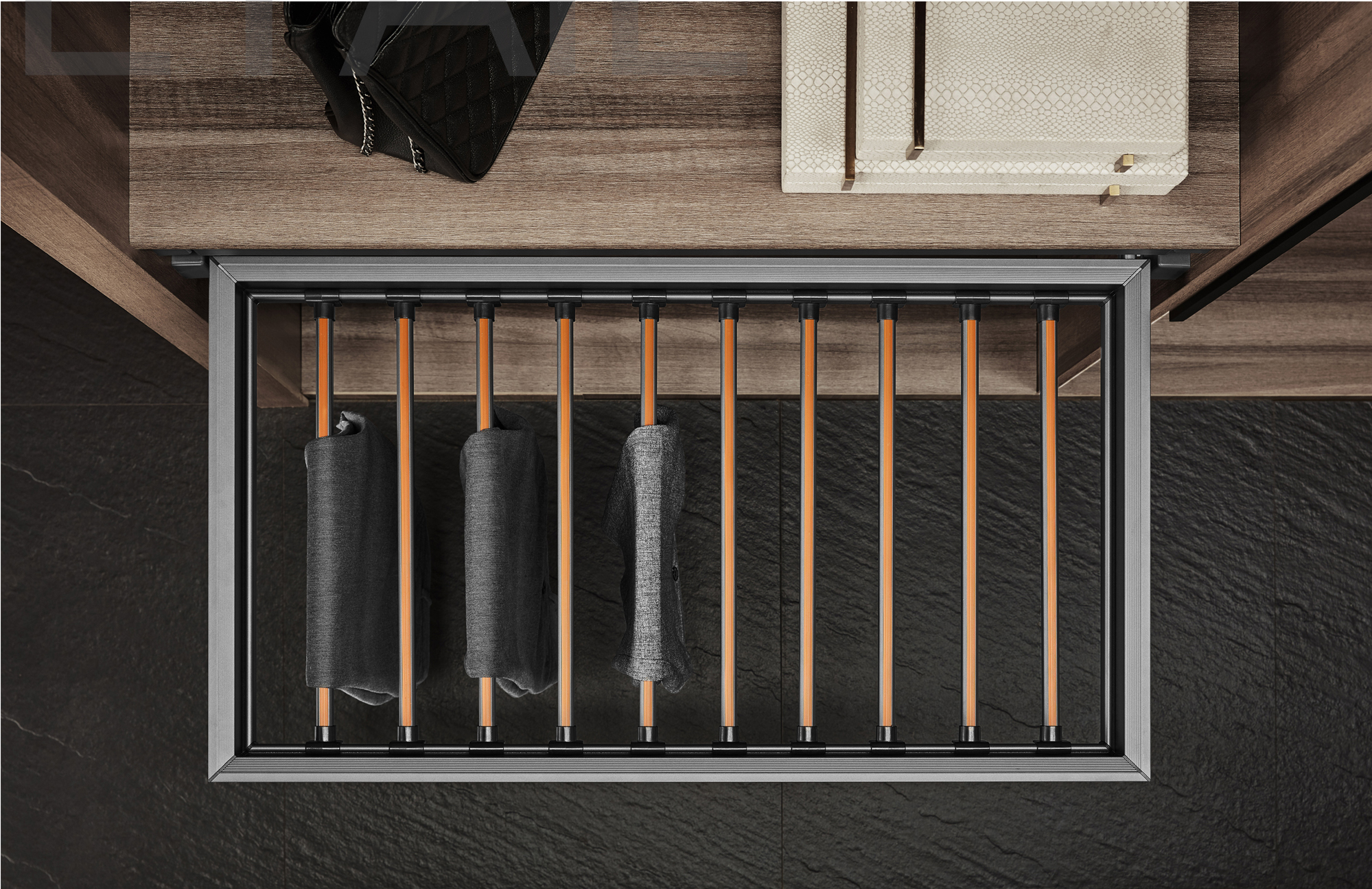 Hệ thống tay âm giảm chấn cao cấp có cấu tạo bền chắc, chịu được tải trọng cao. Có thể mở toàn phần và quan sát được toàn bộ quần trên giá treo. Mở ra, đóng vào dễ dàng, êm ái không phát ra tiếng ồn.