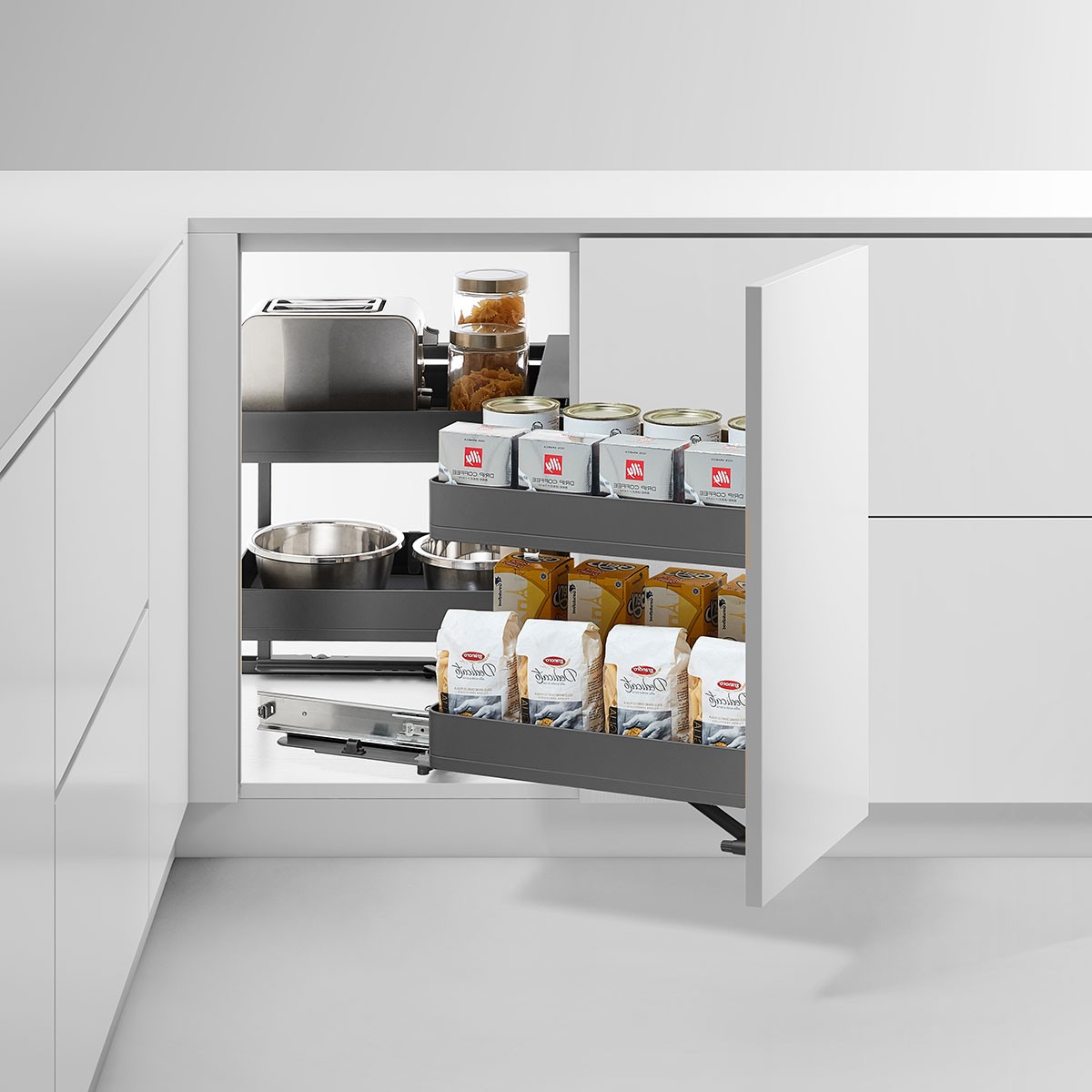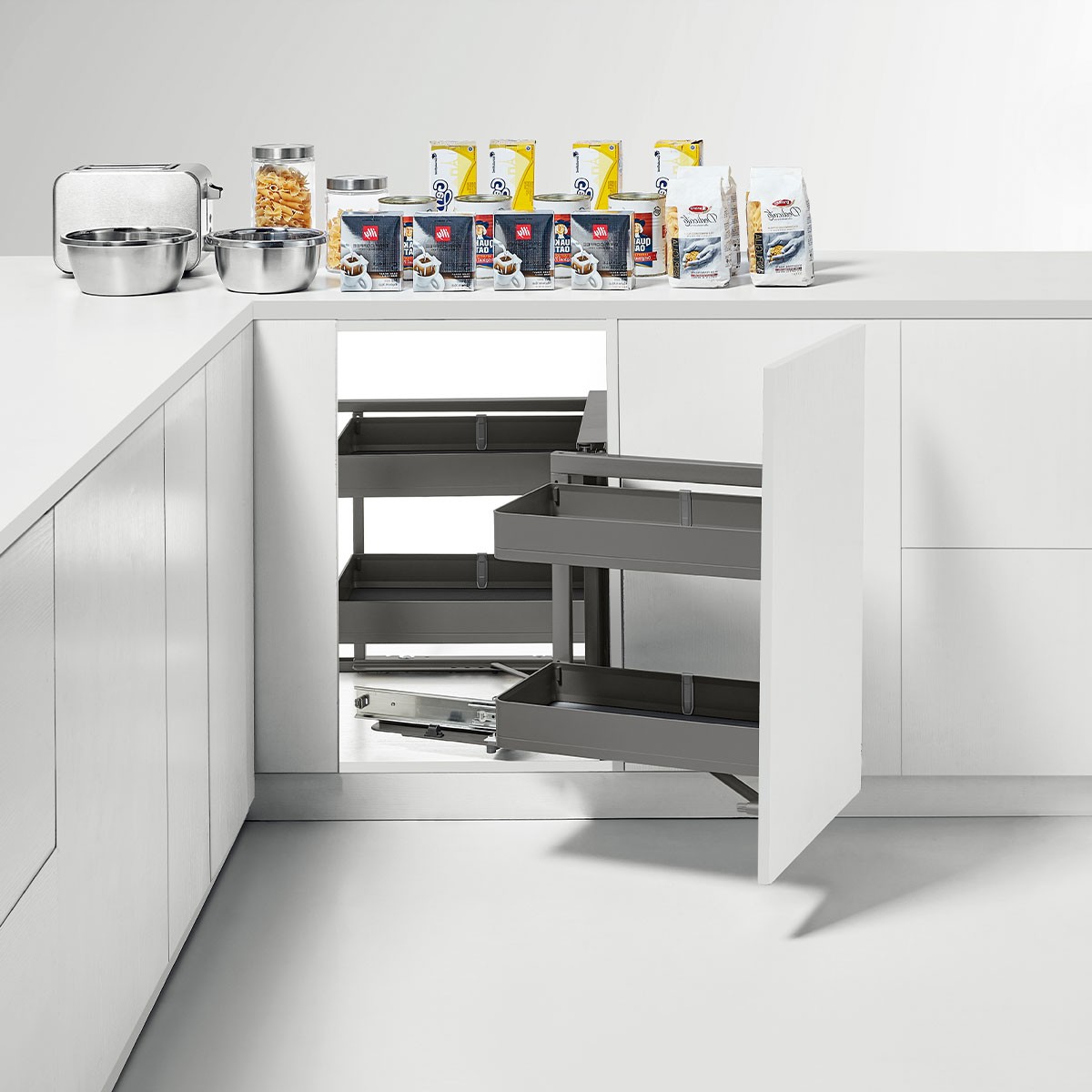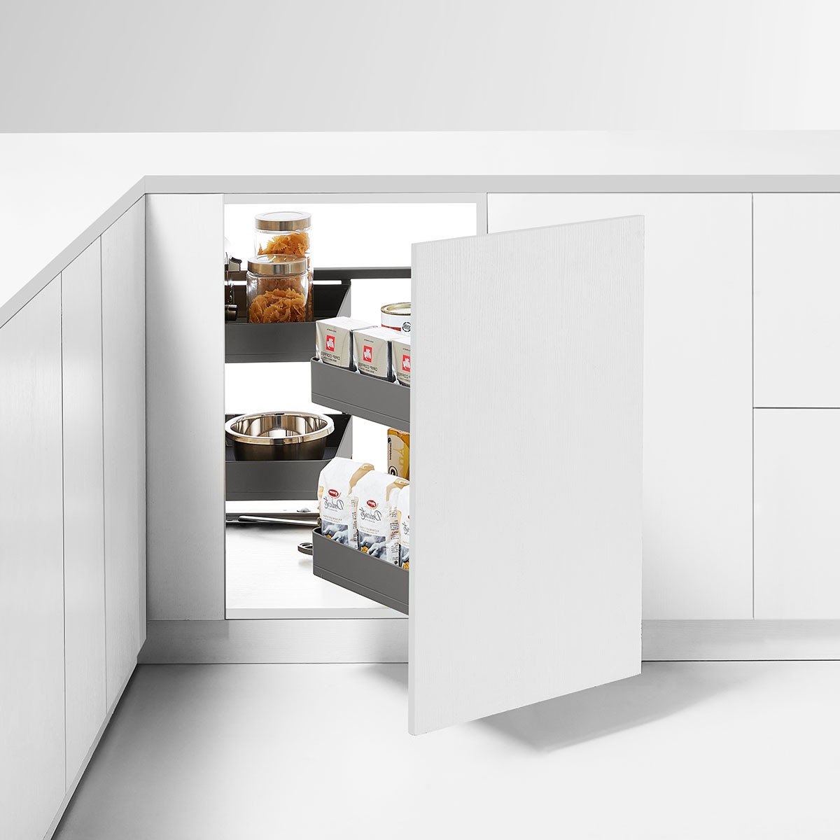 Thay vì xếp đồ đạc một cách không khoa học tạo nên sự bề bộn cho bếp thì góc liên hoàn sẽ đem tới cho bạn sức chứa vô cùng lớn giúp căn bếp luôn sạch sẽ, gọn gàng. Với thiết kế 2 tầng – 4 rổ đựng cùng tải trọng 5kg/mỗi rổ lớn và 3kg/ mỗi rổ nhỏ, bạn có thể tha hồ cất gọn tất cả các vật dùng, đồ ăn.. vào khoang tủ phía sau cánh cửa tủ.