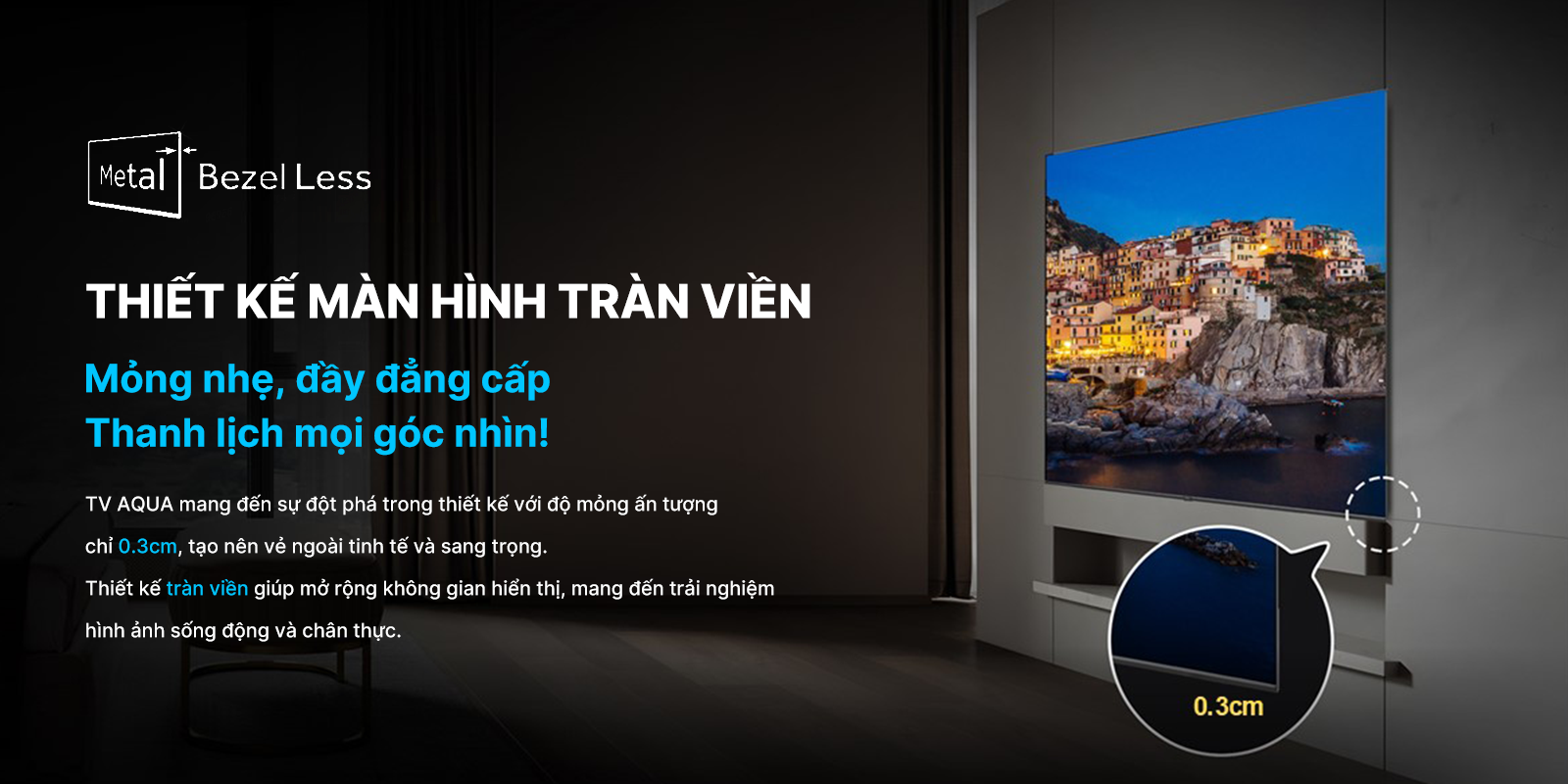 Google Tivi AQUA HD AQT32K85FX 32 inch tạo ấn tượng với khung viền mỏng tinh tế, tạo cảm giác thoải mái khi quan sát. Bên cạnh đó, phiên bản được hoàn thiện với lớp vỏ ngoài sang trọng, thiết kế tối giản, dễ hoà hợp với nhiều kiểu nội thất khác nhau.