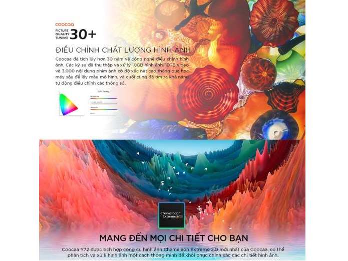 Tivi Coocaa đã áp dụng công nghệ xử lý hình ảnh tiên tiến với sự hỗ trợ của AI thông qua Chameleon Extreme 2.0. Bên cạnh đó, Coocaa 50Y73 còn được trang bị các tính năng nâng cao hình ảnh như HDR10 và HLG, mang đến những trải nghiệm giải trí tuyệt vời trên màn hình LED 8.29 megapixel.