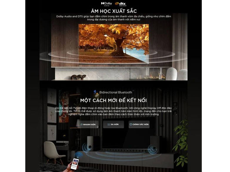 Với khả năng kết nối Bluetooth hai chiều, tivi này có thể trở thành trung tâm để phát hình ảnh và video từ điện thoại hoặc laptop. Đặc biệt, trong trường hợp bạn làm mất hoặc để quên điều khiển, chiếc điện thoại của bạn có thể được sử dụng như một remote tivi tiện lợi.