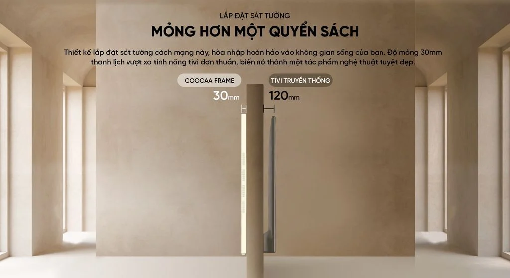 Với độ dày chỉ 30mm, COOCAA Frame+ LN7000G phá vỡ giới hạn của những chiếc TV thông thường. Thiết kế mỏng như một cuốn sách giúp TV ôm sát tường, tạo nên sự liền mạch và thanh lịch cho không gian sống.