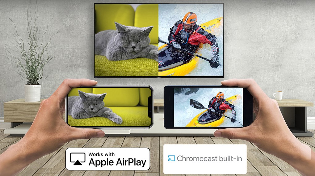 – Điều khiển tivi bằng điện thoại qua ứng dụng Android TV. Trình chiếu nội dung, hình ảnh từ điện thoại lên tivi nhờ Chromecast, AirPlay 2.