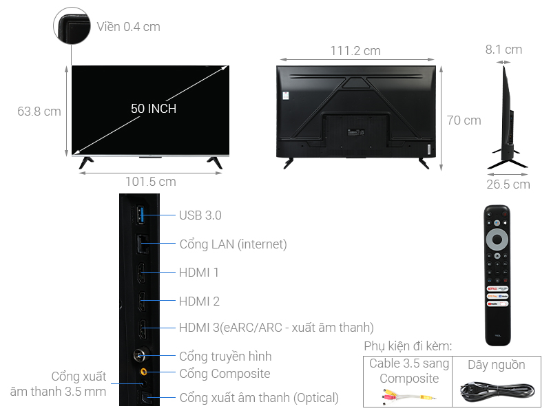 • Kích thước không chân, treo tường: Ngang 111.2 cm - Cao 63.8 cm - 8.1 cm