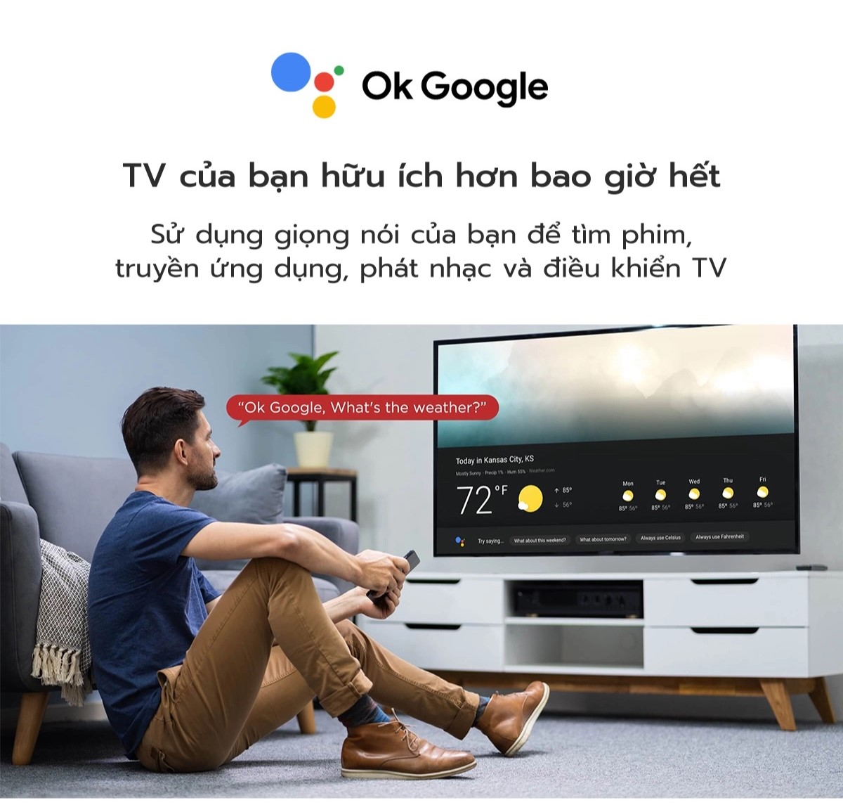 Tivi của bạn giờ đây hữu ích hơn bao giờ hết! Hỏi Google về thời tiết, tỉ số bóng đá và nhiều hơn thế nữa,… bạn sẽ nhận được câu trả lời ngay trên màn hình tivi. Xem và điều khiển các thiết bị trong căn nhà thông minh tương thích bằng giọng nói của bạn.
