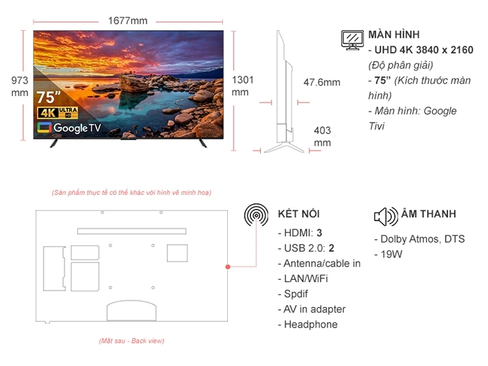 Sở hữu kích thước tivi TCL 4K 75 inch 75P735 sẽ là sự lựa chọn lý tưởng cho các không gian như: phòng khách, phòng họp, nhà hàng, quán cafe,…Bạn có thể đặt tivi lên kệ hoặc treo tường vừa tiết kiệm không gian lại tạo điểm nhấn nổi bật cho căn phòng thêm phần hiện đại.