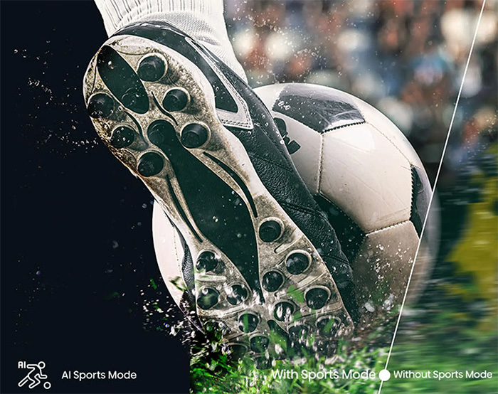 Công nghệ AI Sports Mode đem lại chất lượng hình ảnh và âm thanh tốt nhất để có trải nghiệm xem mượt mà nhất. Bạn có thể nhìn thấy từng vết nứt trên sân, ánh mắt quyết tâm của các cầu thủ và sự phấn khích của đám đông khán giả và nghe được rõ từng lời của bình luận viên.