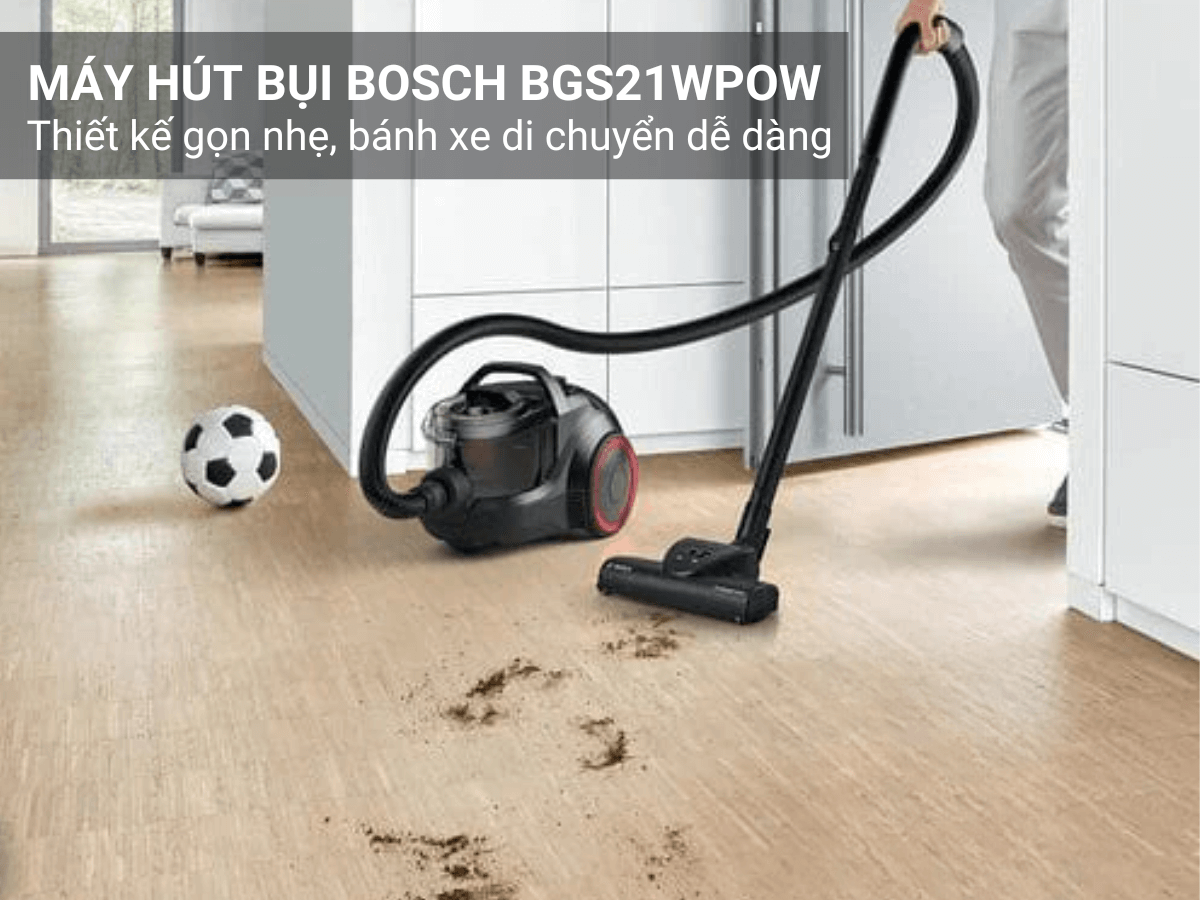 Máy hút bụi Bosch BGS21WPOW sở hữu thiết kế hiện đại, màu sắc mạnh mẽ, sang trọng. Phần thân máy nhỏ gọn, kết hợp với 2 bánh xe lớn và 1 con lăn hỗ trợ người dùng di chuyển nhẹ nhàng, linh hoạt đến nhiều khu vực trong nhà. Ngoài ra máy còn có tay xách thuận tiện khi cần di chuyển xa một cách nhanh chóng.