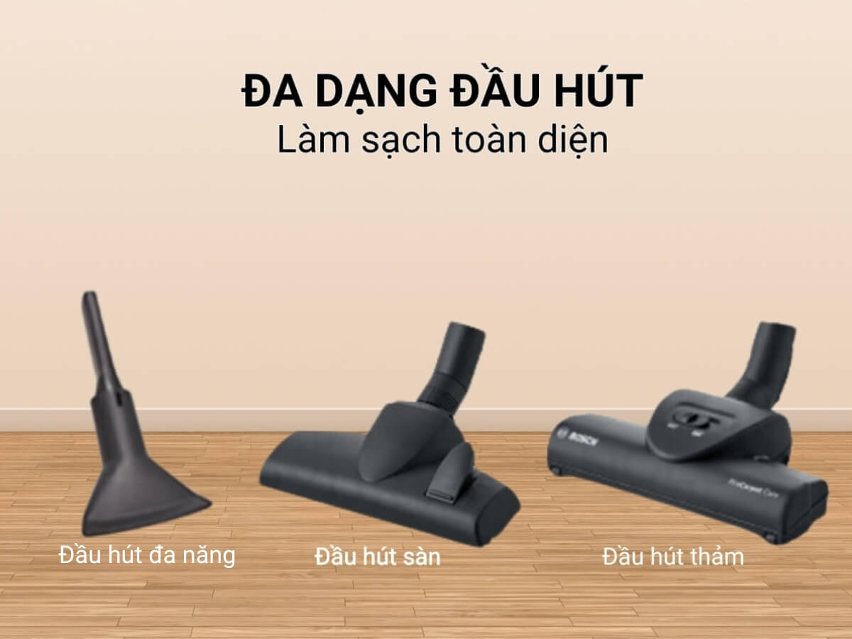 Máy hút bụi này trang bị đầu hút đa năng tăng khả năng hút sạch bụi hiệu quả trên nhiều loại bề mặt. Máy còn kèm theo đầu hút đa năng, đầu hút sàn, đầu hút thảm
