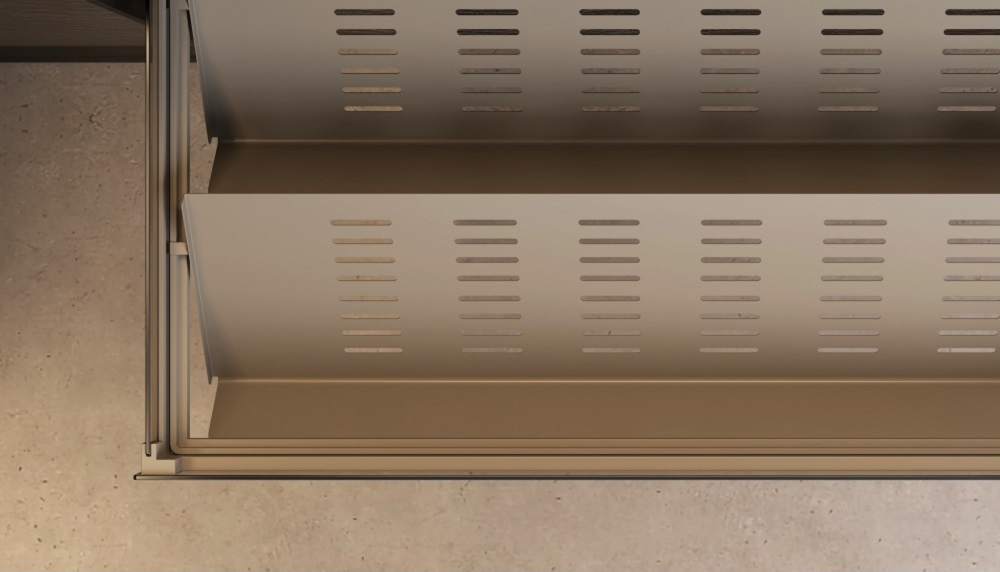 Ray trượt giảm chấn mở toàn phần Kệ được trang bị hệ thống ray âm cao cấp, giúp kéo ra nhẹ nhàng, không gây tiếng ồn, đồng thời mở toàn phần giúp dễ dàng quan sát và lấy giày.