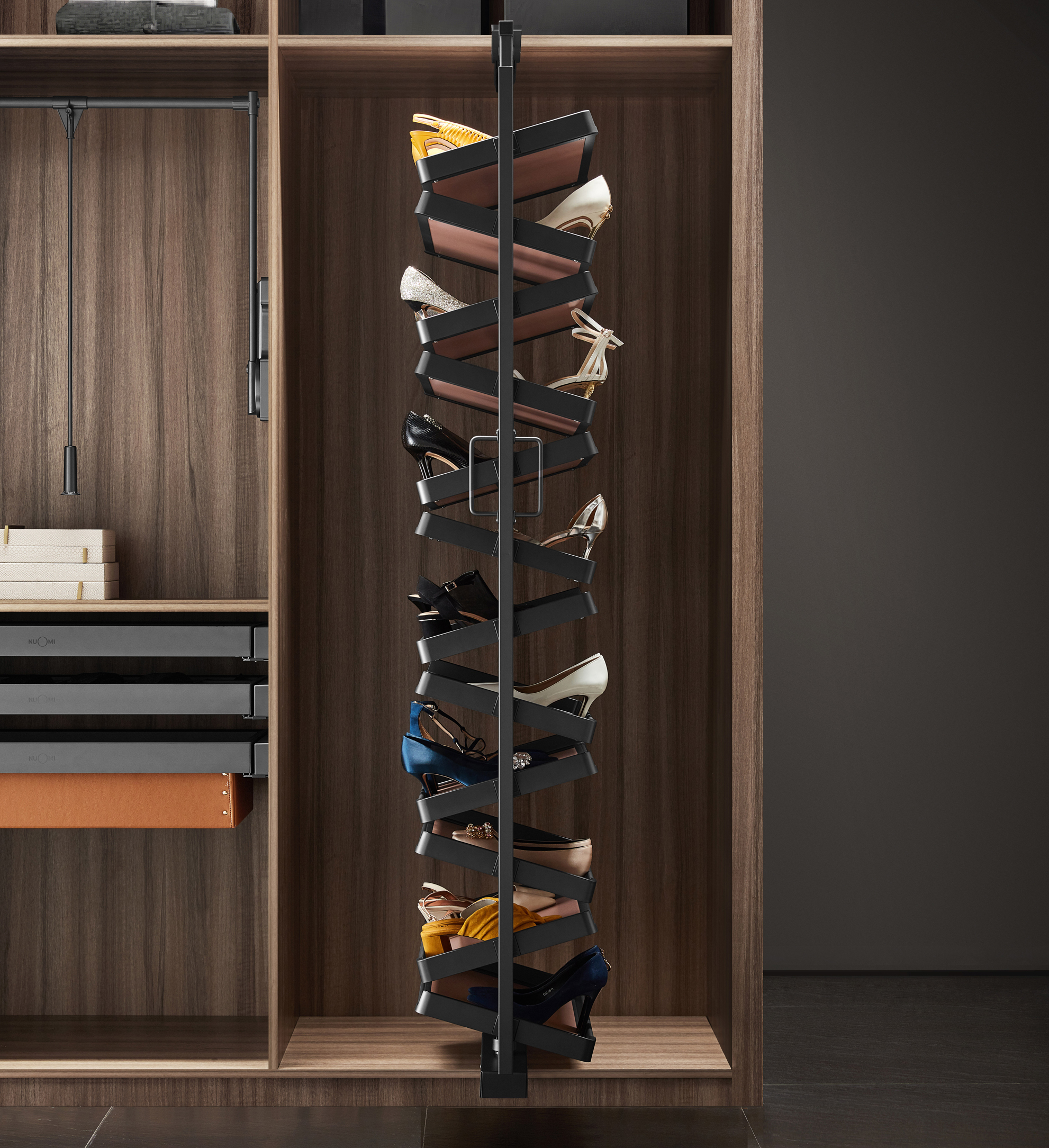 2 trụ trên dưới có thể xoay 360 độ giúp bạn dễ dàng quan sát toàn bộ giày dép trên giá cũng như dễ dàng cất/lấy giày dép khi cần, đây là điểm khác biệt mà không một kệ giày dép nào trên thị trường hiện nay có được.