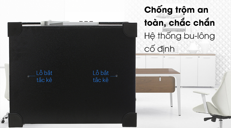 Nhà sản xuất cũng trang bị lỗ bắt vít bên trong két sắt giúp cố định vị trí của két khi sử dụng. Nhờ đó, két sắt sẽ tránh được tình trạng bị trộm di chuyển.