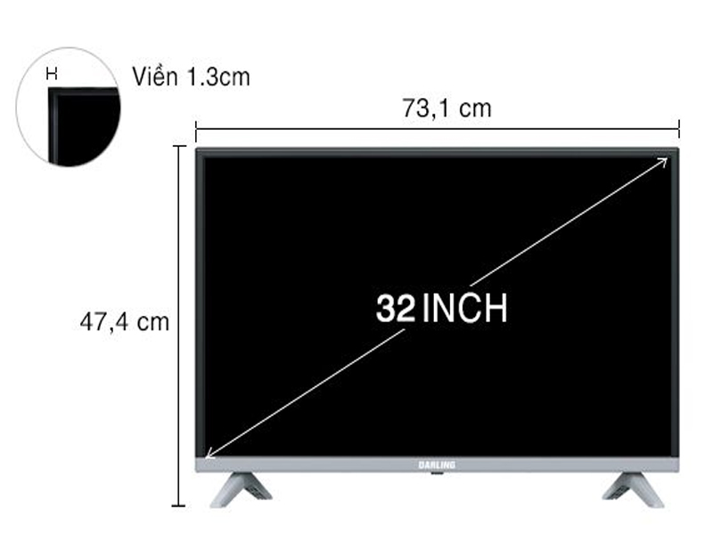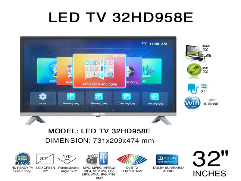 Với thiết kế độ rộng màn hình 32 inch, Tivi Smart Darling 32HD958E hoàn hảo dùng để hiển thị như một chiếc máy tính để bàn. Hỗ trợ 2 cổng HDMI tiện dụng và đáp ứng tốt nhu cầu sử dụng.