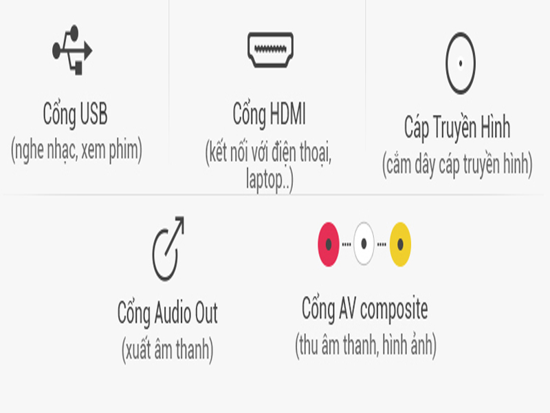 + Cổng VGA: Cho phép kết nối hình ảnh, âm thanh từ laptop sang tivi để hiển thị nội dung.