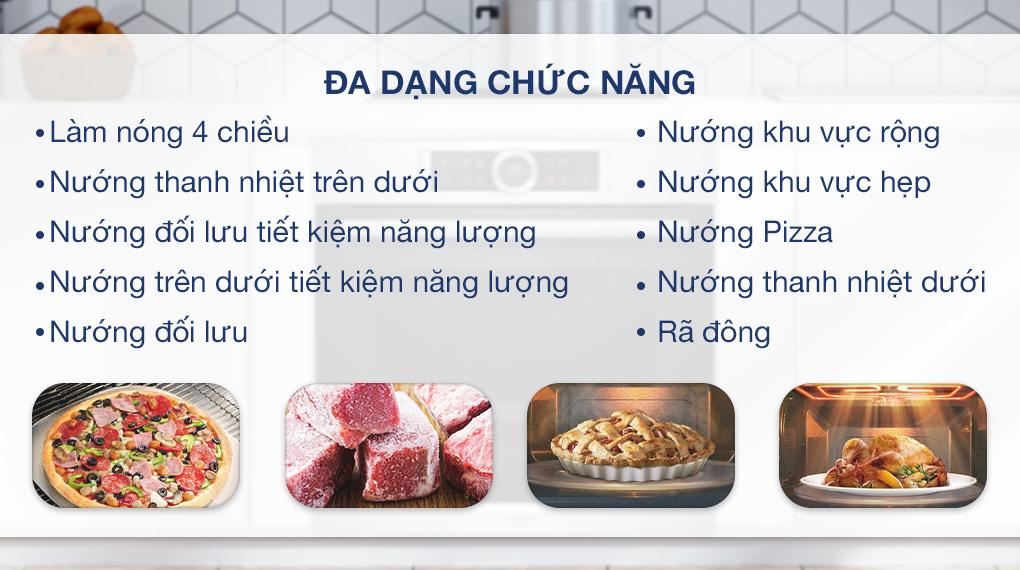 – Lò nướng sử dụng công nghệ làm nóng bằng thanh nhiệt và làm nóng đa chiều 4D hot air, giúp món nướng chín ngon đồng đều ngay cả khi nướng nhiều món cùng lúc.