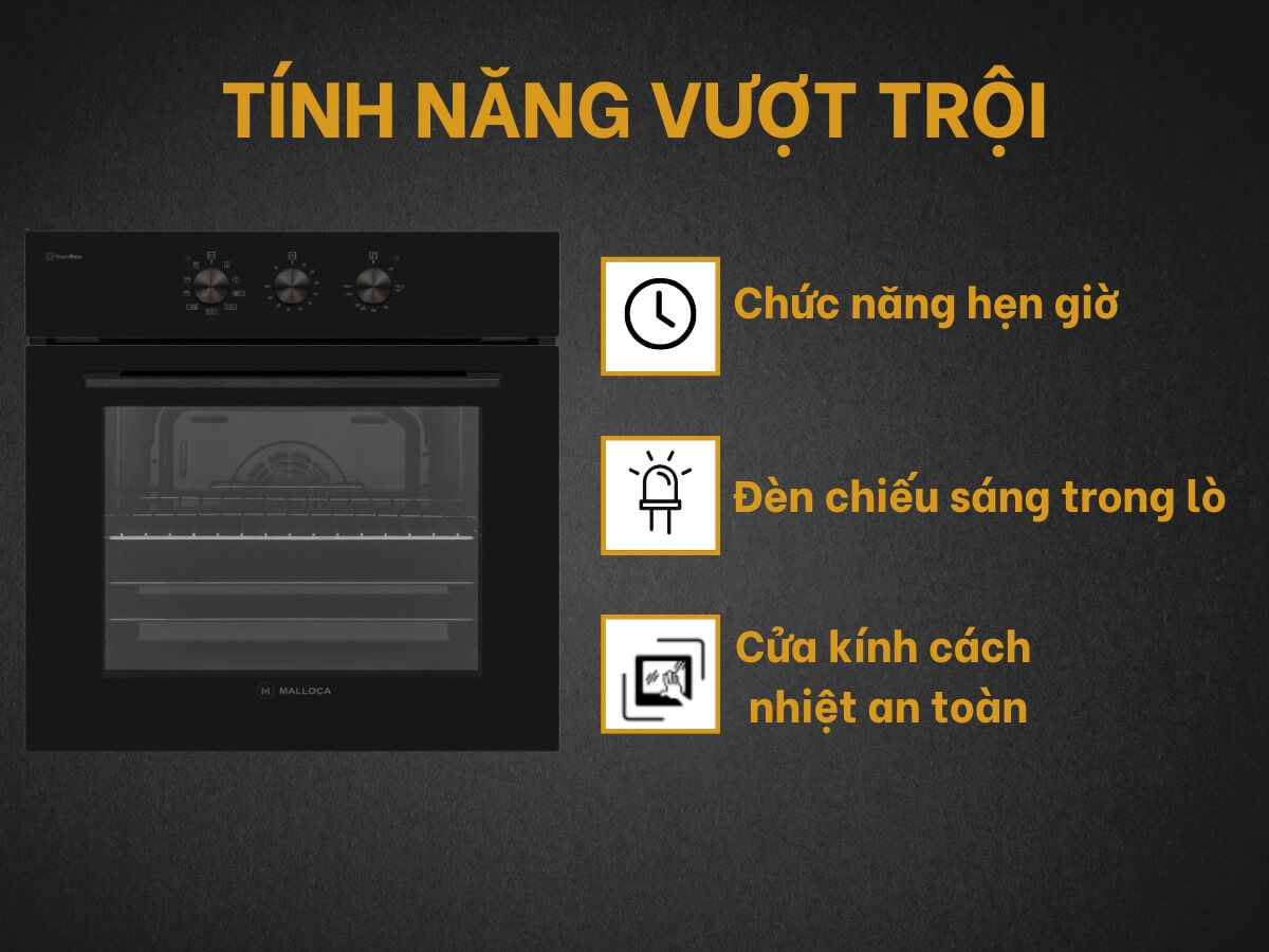 Lò nướng Malloca MOV-659 MCB được trang bị 9 chế độ chức năng, với công suất 3100W và dải nhiệt rộng 50ºC – 250ºC, giúp bạn dễ dàng tuỳ chỉnh để chế biến đa dạng món ngon cho gia đình. Bạn có thể nướng thịt, gà, nướng bánh quy, pizza, bánh bông lan, rã đông thực phẩm…