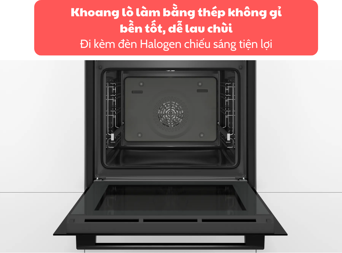– Chất liệu của khoang lò nướng Bosch HBA534EB0K là thép không gỉ được tráng men, chống bám dính dầu mỡ và giúp vệ sinh lò dễ dàng hơn.