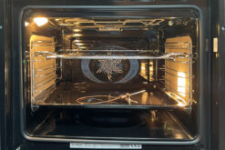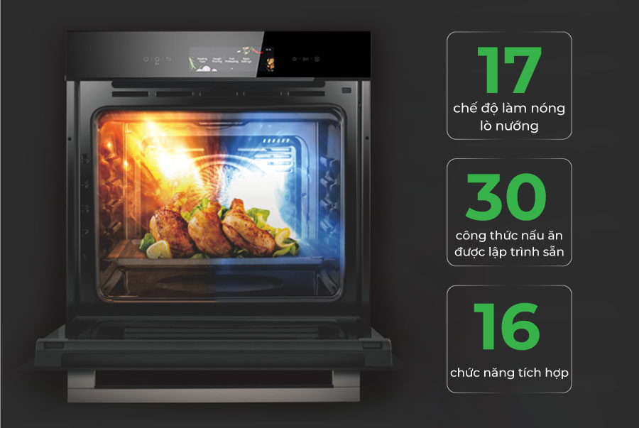 Điều khiển cảm ứng TFT, Màn hình hiển thị TFT (Thin Film Transistor) với độ sắc nét cao, giúp người dùng dễ dàng quan sát, kiểm soát và điều chỉnh quá trình hoạt động của lò về chế độ nướng, công suất, thời gian… cửa lò bằng kính cường lực 3 lớp, chịu lực và nhiệt cao để đáp ứng nhu cầu nấu nướng của gia đình bạn, do lò có nhiệt độ khá cao 250 độ C với các loại kính thường sẽ không chịu được ở mức nhiệt độ trên và dễ bị sock nhiệt dẫn đến rạn nứt. Bên cạnh đó chức năng đối lưu giúp thức ăn chín đều hơn mà không cần phải trở mặt thực phẩm, các món bánh khi ra lò sẽ có màu vàng óng và phồng hơn với đặc biệt với shuffle, cupcake, waffle… Hệ thống làm sạch Catalytic, hệ thống làm mát cưỡng bức: Hỗ trợ cho quá trình vệ sinh máy một cách dễ dàng. Đối với các thiết bị hoạt động sinh nhiệt, hệ thống làm mát vô cùng cần thiết để máy hoạt động bển bỉ , bền vững. Thiết bị Rotisserie giúp thịt nướng giòn và vàng: Thiết bị này giúp thực phẩm trong lò được chín đều thông qua các vòng quay liên tục trong lò, giúp thực phẩm đảm bảo chín đều vàng giòn đẹp mắt. Chức năng làm nóng siêu nhanh và que thăm dò nhiệt độ. Hỗ trợ người dùng nấu nướng một cách chuẩn xác và nhanh chóng. Chức năng hẹn giờ khởi động: Đây là tính năng giúp người sử dụng có thể thiết lập lịch trình hoạt động của lò cho phù hợp nhu cầu đun nấu.Tín hiệu báo kết thúc quá trình nấu ăn: Khi kết thúc chương trình, lò cảnh báo bằng âm “tít” để báo hiệu cho người dùng Chiếu sáng 2 đèn – Twin lamps 17 chế độ làm nóng lò nướng: tùy theo nhu cầu và loại thực phẩm có thể điều chỉnh phù hơp 30 công thức nấu ăn được lập trình sẵn: Lò nướng được lập trình sẵn 80 công thức nấu ăn cho từng loại thực phẩm nhất định, người tiêu dùng có thể dễ dàng chọn chương trình tự động theo bảng chú thích trong quyển hướng dẫn sử dụng. 16 chức năng tích hợp: Đèn, Điện phân, Nhiệt bức xạ, Nướng đôi, Nướng đôi + quạt, Nhiệt dưới + nướng, Quạt thông thường + quạt, Đối lưu, Pizza, Rã đông, ECO, Lên men.. Ngoài ra với mỗi kiểu nướng (nướng đối lưu, nướng quạt, …) còn giúp lò có khả năng tạo ra hàng trăm kiểu chế biến thức ăn khác nhau.
