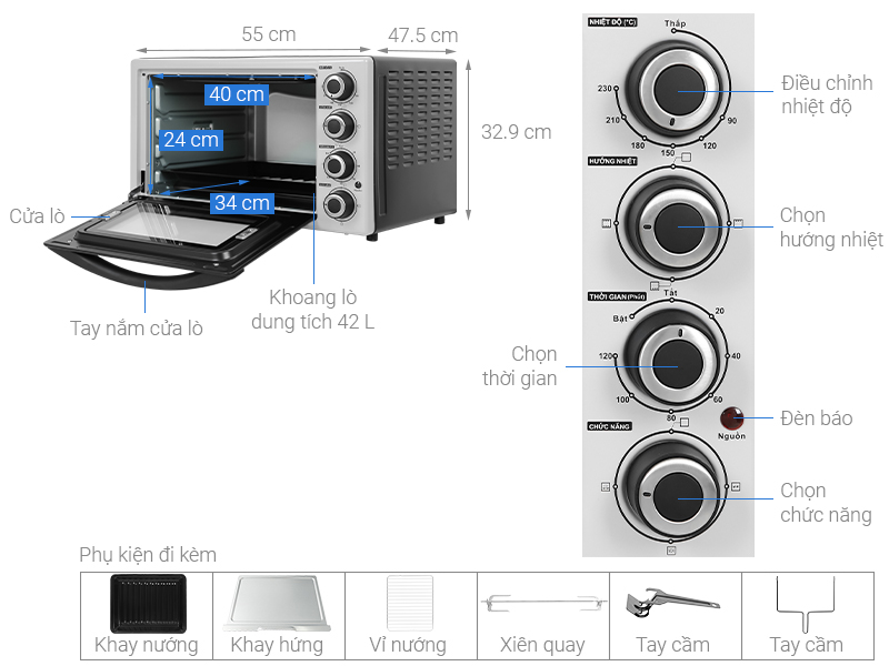 Đáp ứng nhu cầu nướng bánh, nướng thịt cá, rau củ trong gia đình, quán ăn với dung tích 42 lít