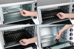 Có khay hứng dầu mỡ, khay nướng, vỉ nướng, que xiên quay, 2 loại tay cầm đi kèm lò. Đặc biệt, bạn có thể nướng gà, vịt nguyên con, thịt miếng lớn dễ dàng với xiên quay.