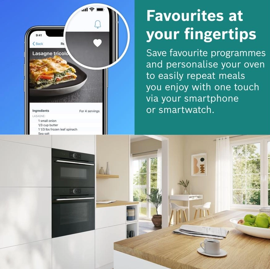 Để tránh phải nhập lại cùng một cài đặt cho món ăn yêu thích của bạn nhiều lần, chỉ cần lưu chúng trong mục “Favourites” để bạn có thể truy cập chúng ngay lập tức và bất kỳ lúc nào, trong ứng dụng Home Connect. Để tận hưởng “Favourites”, chỉ cần kết nối lò nướng kết hợp hấp Bosch HSG7361B1 của bạn với tài khoản Home Connect đã đăng ký.