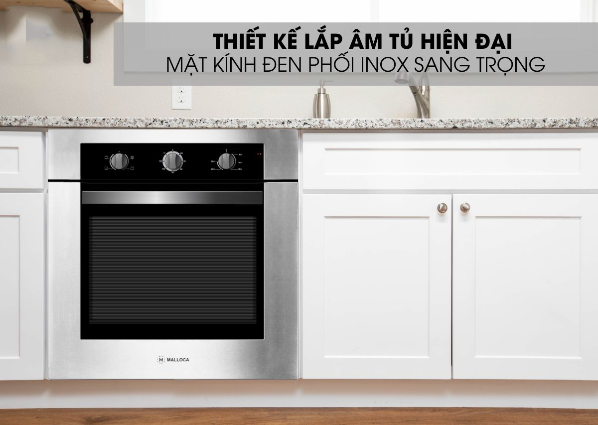 Mặt trước của lò nướng Malloca là lớp kính màu đen phối cùng inox cao cấp đem đến cảm giác sang trọng, hiện đại. Tô điểm cho căn bếp của bạn thêm phần nổi bật hơn.