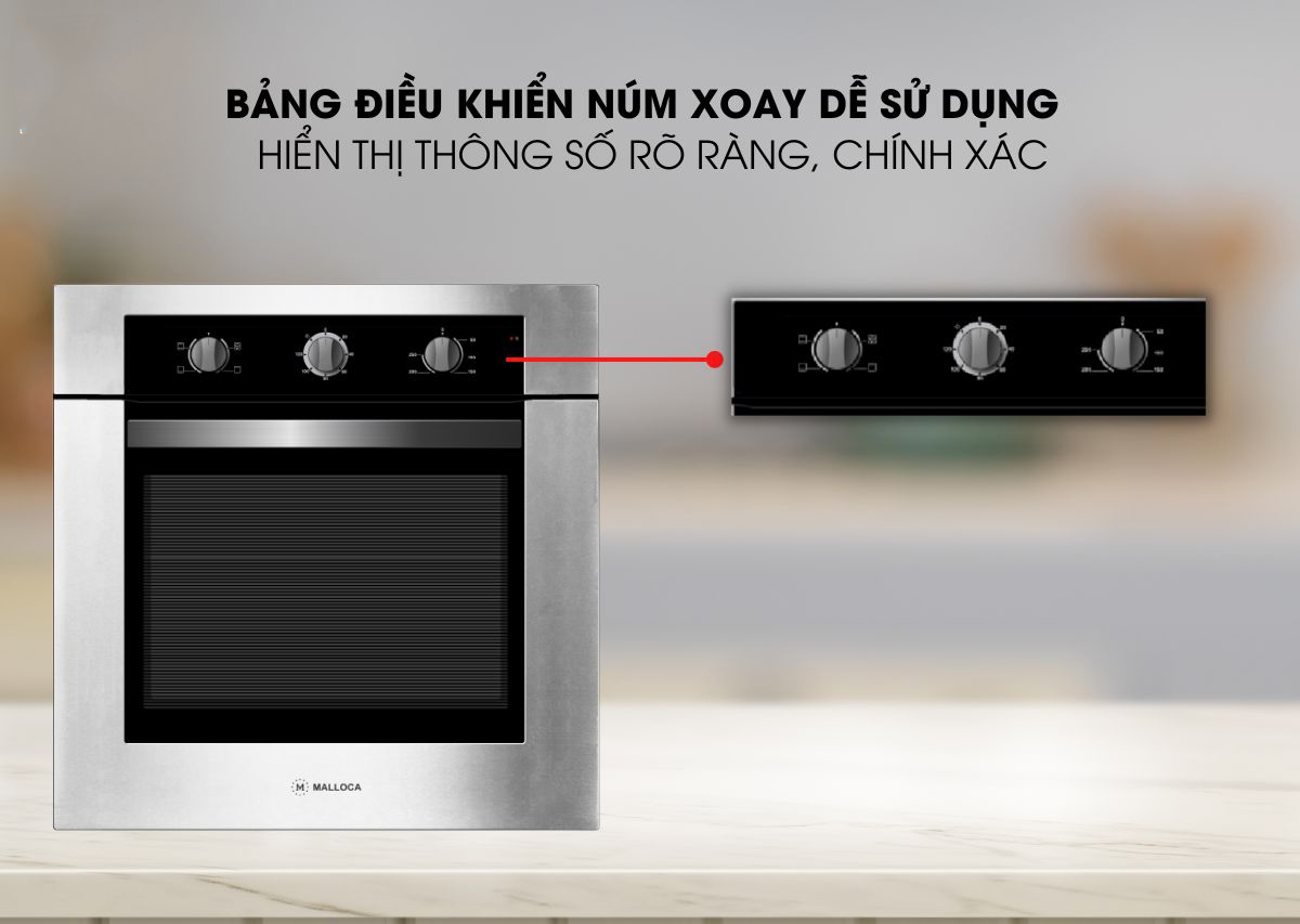 Lò được trang bị bảng điều khiển núm xoay dễ dàng thao tác với 3 núm xoay trên bảng điều khiển. Bảng điều khiển được thương hiệu Malloca thiết kế rất trực quan giúp người dùng dễ dàng điều chỉnh.