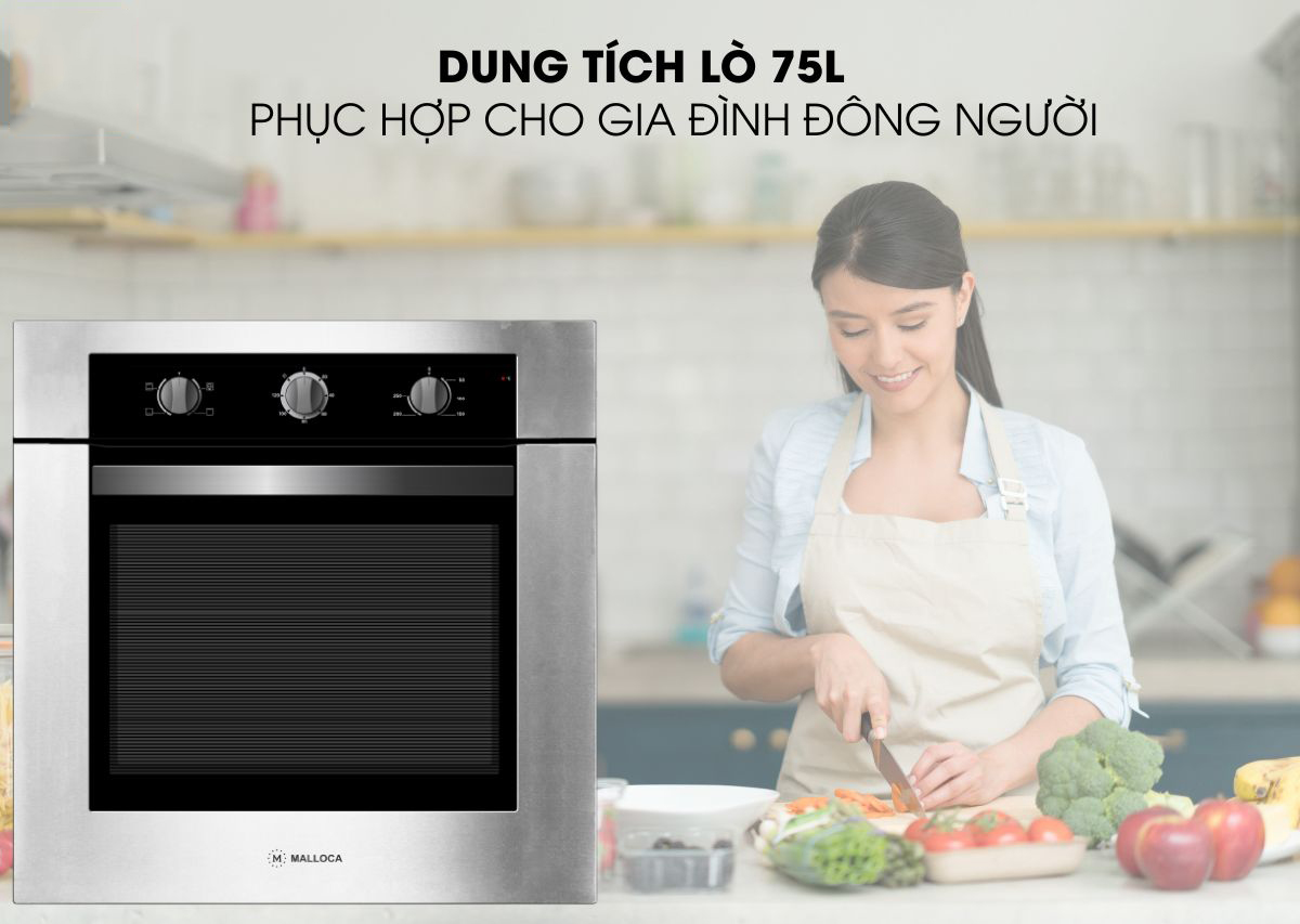 Lò có dung tích lớn 75L, có thể nướng gà nguyên con và các mảng thịt lớn. Có thể đồng thời chế biến nhiều món ăn cùng lúc, thích hợp cho các gia đình nhiều thành viên.