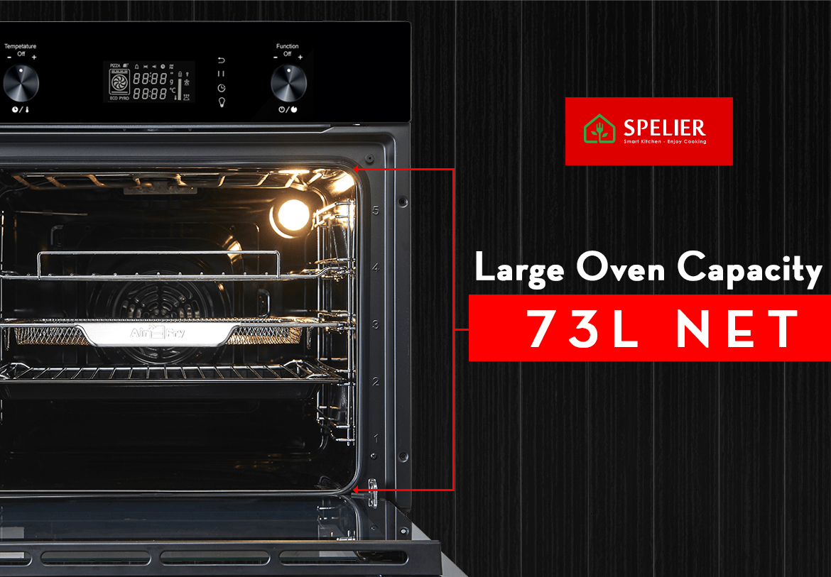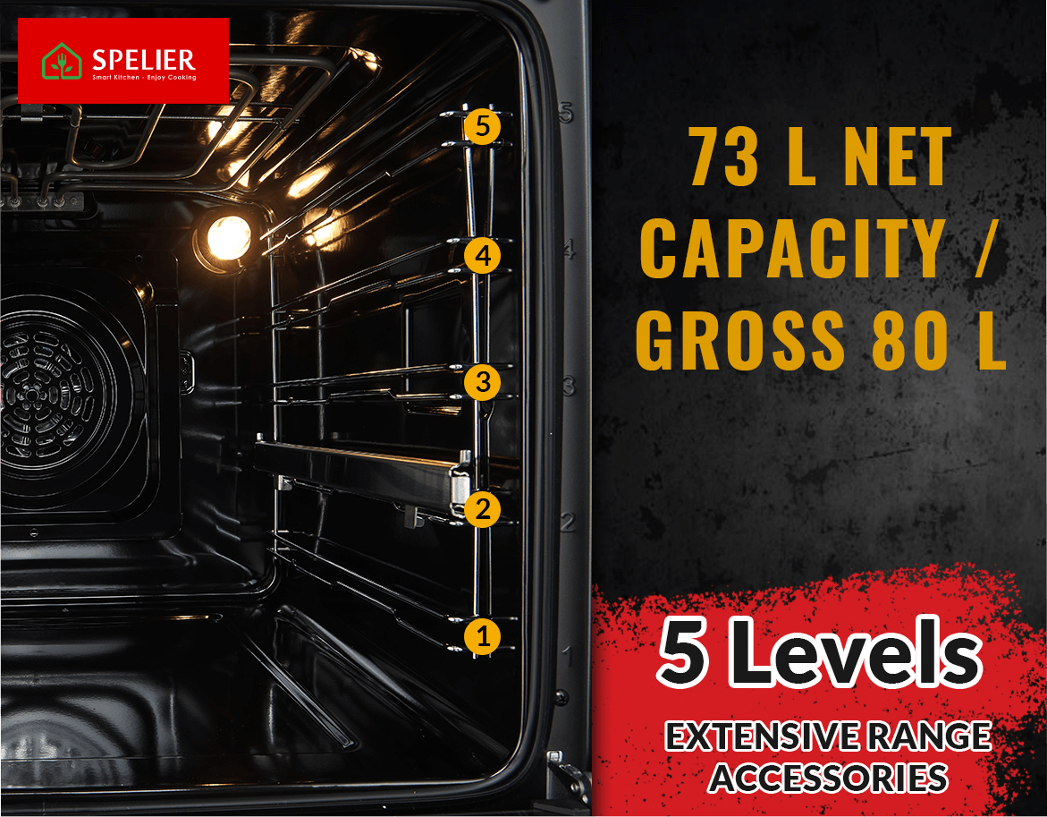 Dung tích lò nướng Spelier SPB 80 PYR/BLACK lên tới 80L có thể nướng nguyên 3-4 con gà tầm 2 kg, 4-5 khay bánh cùng lúc, kết hợp với công suất nướng đến 2900W, nướng nhanh, mạnh mẽ. Khoang lò 5 tầng dễ dàng điều chỉnh vị trí khay nướng phù hợp với kích cỡ thực phẩm giúp món ăn chín đều, tiết kiệm thời gian, công sức.