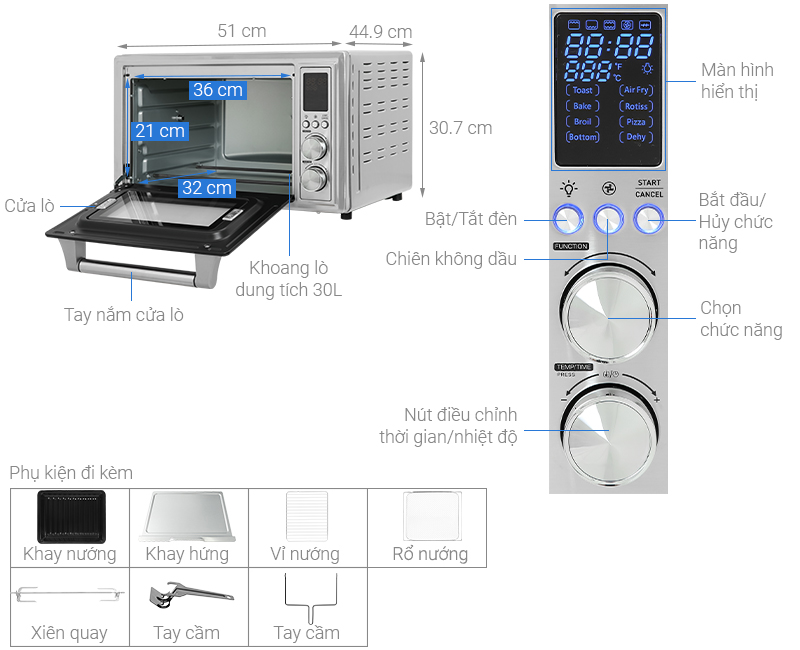 Dung tích 30 lít, nướng được gà nguyên con tầm 1 – 1.5 kg, công suất nướng 1800W mạnh mẽ