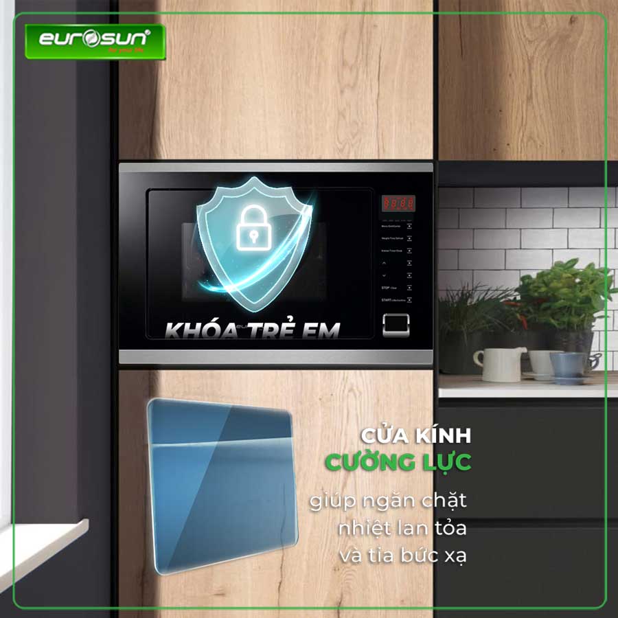 Lò vi sóng MWO-30EUR nhập khẩu nguyên chiếc từ Malaysia là sản phẩm lò vi sóng cao cấp 2 trong 1 (vi sóng và nướng kết hợp) dung tích 28L sử dụng thoải mái cho đại đa số gia đình Việt. Lò vi sóng Eurosun MWO-30EUR có thiết kế sang trọng, sử dụng vật liệu cao cấp nhất trong ngành thực phẩm là Inox 304 (18/10) kết hợp kính cường lực đen chống bám bẩn và vân tay, tạo vẻ ngoài sang trọng và cuốn hút. Lò có hệ thống quạt tự làm mát hiệu quả