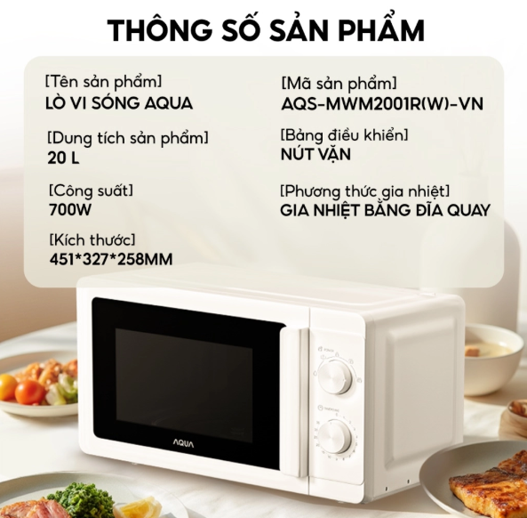 Trong nhịp sống bận rộn ngày nay, một chiếc lò vi sóng tiện dụng là trợ thủ đắc lực giúp bạn tiết kiệm thời gian nấu nướng mà vẫn đảm bảo hương vị món ăn. Lò vi sóng AQUA AQS-MWM2001R(W)-VN chính là lựa chọn hoàn hảo dành cho gia đình hiện đại với thiết kế tối giản, dễ sử dụng và mức giá cực kỳ hợp lý