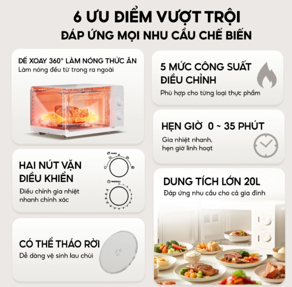 - Dung tích 20 lít: Phù hợp với nhu cầu hâm nóng, rã đông và chế biến món ăn cho gia đình nhỏ đến trung bình.