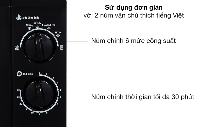 - Bảng điều khiển nút vặn tiếng Việt dễ dàng sử dụng, có 6 mức công suất từ thấp đến cao và thời gian hẹn giờ từ 0 – 30 phút phù hợp với từng loại thực phẩm