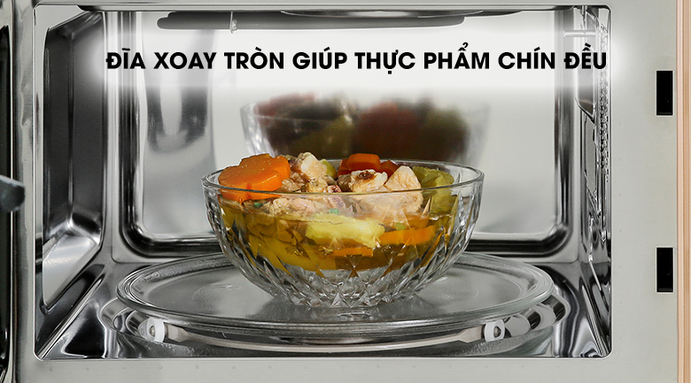 Đĩa xoay tròn, lớn với đường kính 27 cm cho món ăn chín đều, ngon hơn, lò có đèn chiếu sáng