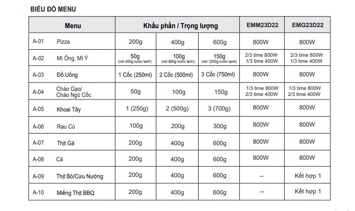 – Chức năng chính: rã đông, hâm nóng, nấu, nướng.