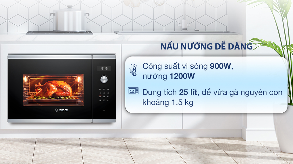 – Lò vi sóng Bosch này có công suất vi sóng 900W, công suất nướng 1200W, hoạt động ổn định.