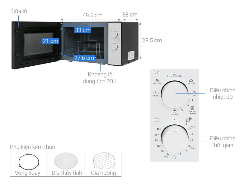 Dung tích 23 lít cùng khoang lò rộng rãi, có thể hâm, nấu được 1 tô canh lớn, nấu được nhiều thức ăn cùng lúc.
