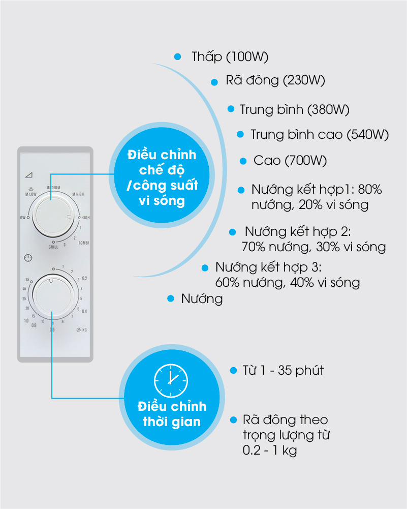 Bảng điều khiển nút vặn dễ thao tác giúp bạn tùy chọn thời gian, công suất phù hợp với từng loại thức ăn
