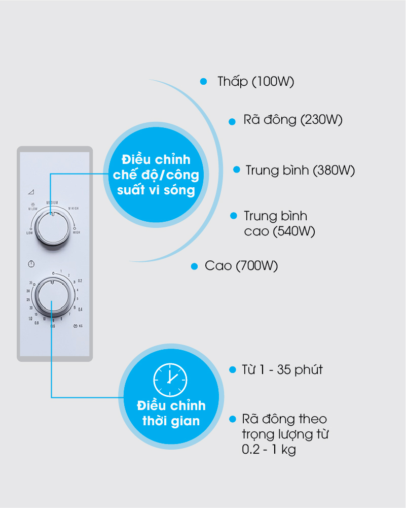 Cài đặt chức năng nấu, hâm nóng, rã đông, công suất 1450 W, hẹn giờ đến 35 phút giúp việc sơ chế, nấu chín các món ăn tiện lợi, nhanh chóng hơn