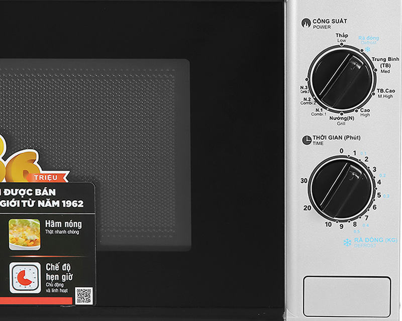 Sharp R-G225VN-BK trang bị điều khiển cơ dạng núm vặn giúp người dùng dễ dàng thao tác nhanh chóng kích hoạt lò, với một núm có chức năng chỉnh công suất + chế độ, một núm chức năng cài đặt thời gian. Chỉ dẫn tiếng Việt đơn giản, dễ hiểu với cả người lớn tuổi, dễ dàng sử dụng ngay trong lần đầu tiên. Với các món ăn cần được nấu trong thời gian chính xác, chức năng hẹn giờ lên đến 30 phút sẽ giúp bạn đạt được độ chín mong muốn, giữ trọn hương vị thơm ngon hoàn hảo.