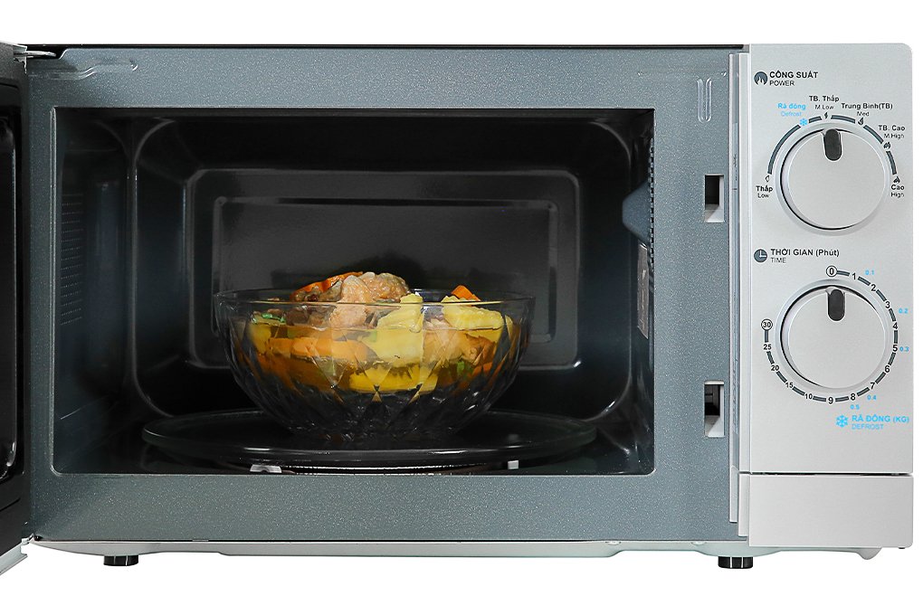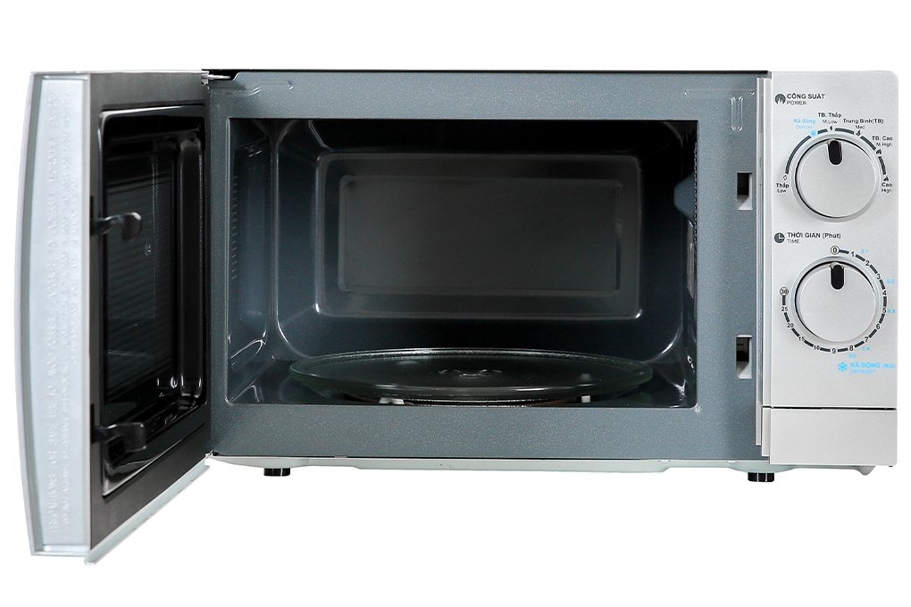 Lò vi sóng dung tích 20 lít được tráng men xám tạo cảm giác thoáng, rộng. Đĩa xoay thủy tinh trang bị trong lò giúp thức ăn chín ngon và đều.
