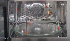 Phần thân lò làm từ chất liệu thép không gỉ không gỉ, chắc chắn, không bám dấu vân tay. Cửa lò bằng kính cường lực cao cấp màu đen có khả năng chịu lực, chịu nhiệt, giữ ổn định nhiệt độ trong khoang, độ bền cao. Khoang lò sử dụng vật liệu Inox 304 – 18/10 đảm bảo an toàn thực phẩm và dễ dàng vệ sinh. Đĩa xoay thủy tinh chịu nhiệt, đường kính 315mm làm cho thức ăn chín đều.