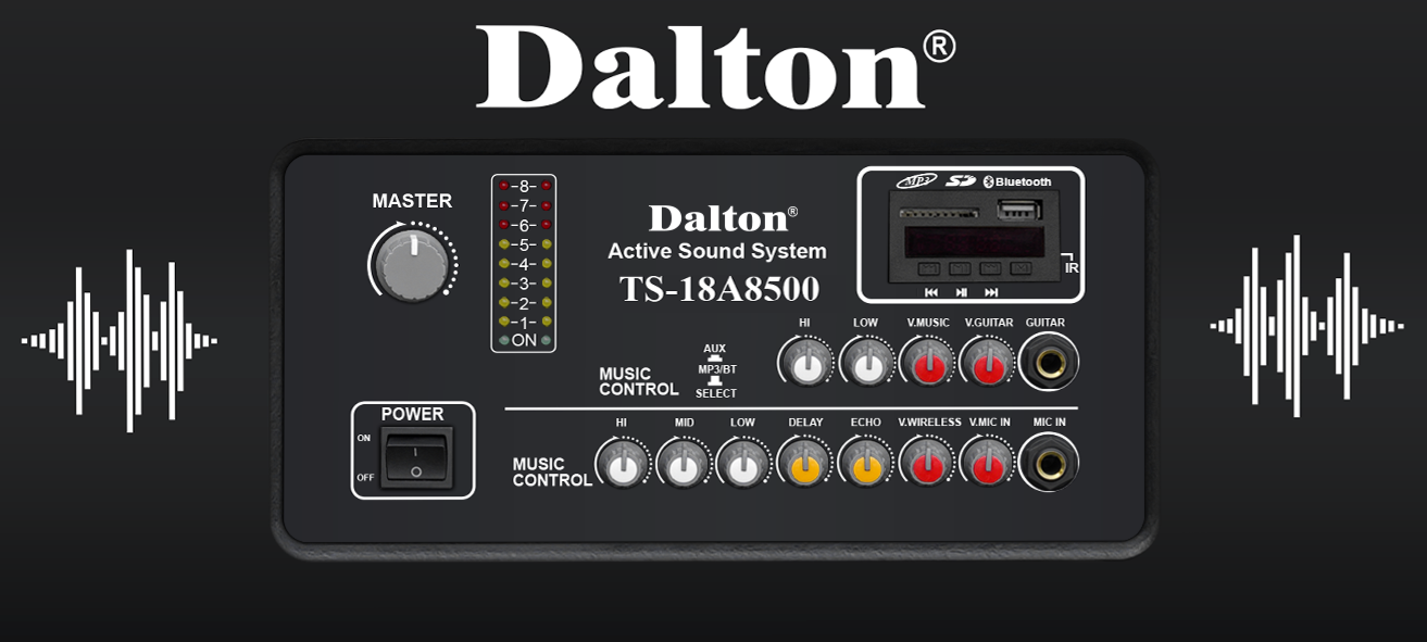 Loa karaoke Dalton TS-18A8000 trang bị bảng điều khiển phía trước với các nút chỉnh được ký hiệu rõ ràng cho bạn dễ dàng quan sát và tùy chỉnh chức năng chuẩn xác cho âm thanh của loa và âm thanh micro.