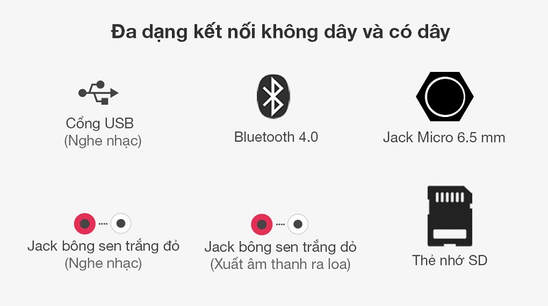 Loa hỗ trợ các hình thức kết nối như: Bluetooth 5.0, thẻ nhớ SD, USB, đài FM, jack cắm bông sen.