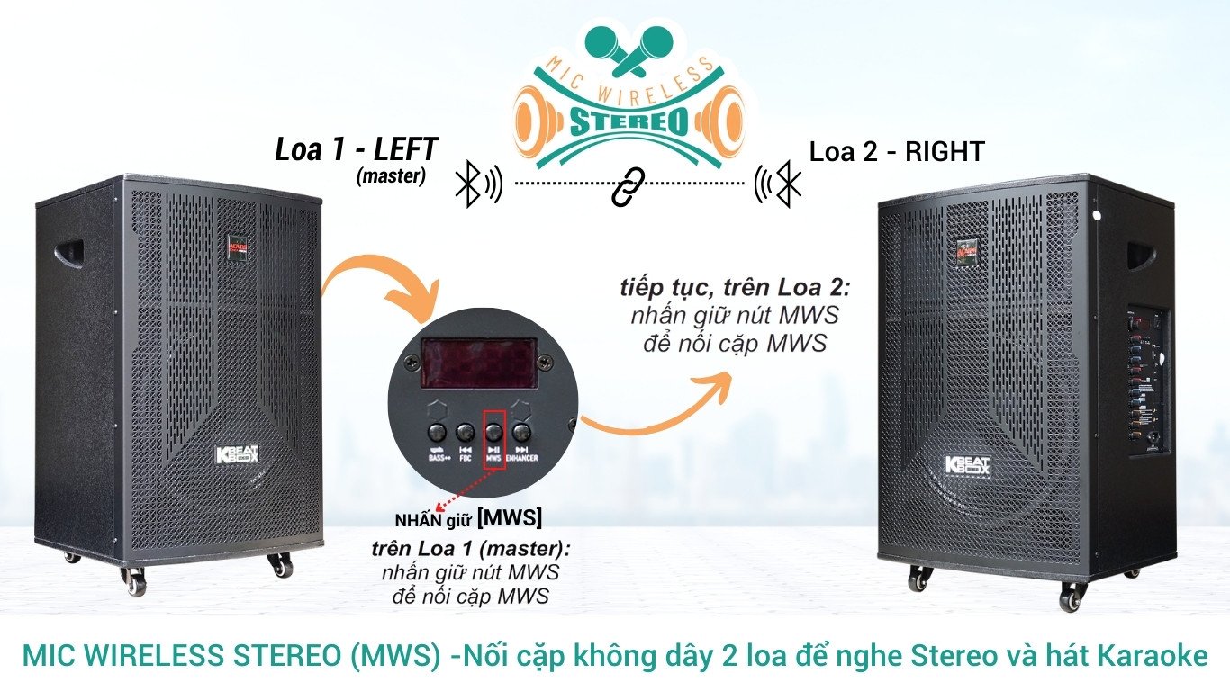 Mic Wireless Stereo (MWS) là tính năng nối cặp không dây 2 loa để nghe Stereo và hát Karaoke.