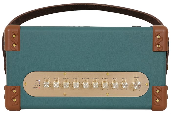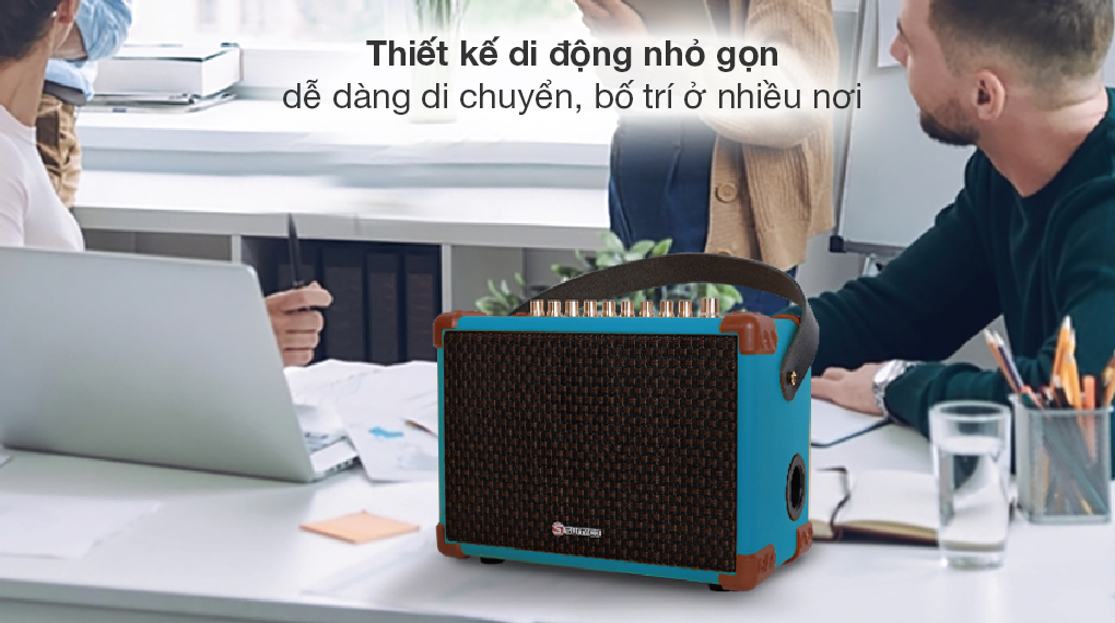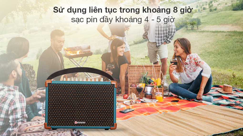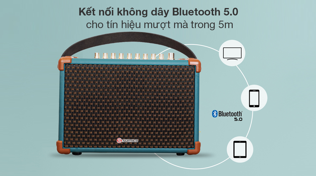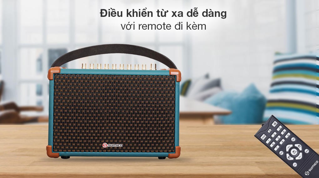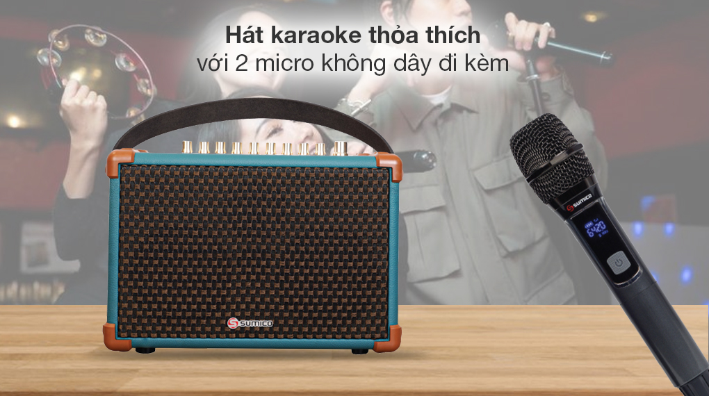 – Mẫu loa karaoke xách tay Sumico này có thiết kế nhỏ gọn mang nét hoài cổ độc đáo, bề mặt được bao phủ với tông màu xanh chủ đạo thanh lịch, 8 góc loa được bọc nhựa màu nâu nổi bật giúp tạo điểm nhấn, tăng cường bảo vệ vỏ và góc thùng loa.