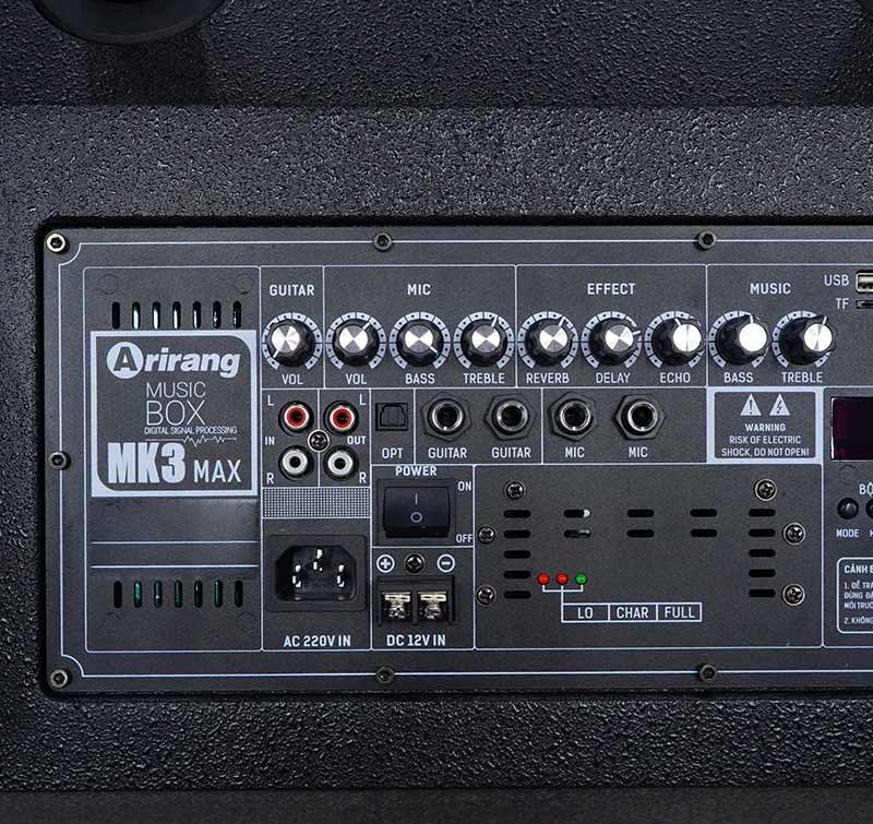 Arirang MK3 MAX trang bị các núm điều chỉnh âm thanh rất tiện lợi. Người dùng có thể dễ dàng tinh chỉnh các dải âm như bass, treble, âm lượng nhạc, echo, delay và micro. Âm thanh sẽ được tùy chỉnh theo sở thích và không gian sử dụng, mang lại chất lượng tối ưu nhất cho mọi buổi biểu diễn hay hát karaoke.