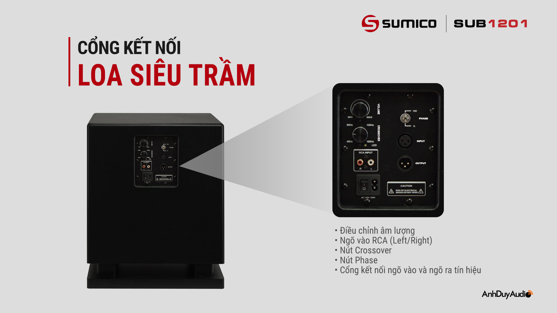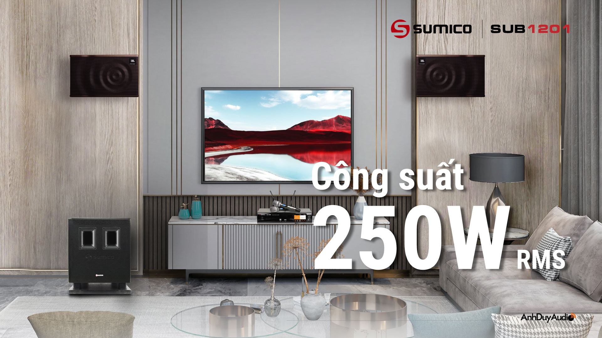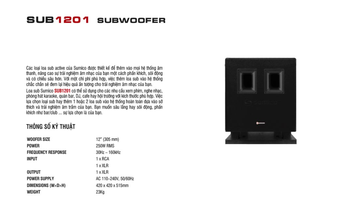 Loa siêu trầm chủ động tích hợp công suất Sumico SUB1201 được thiết kế đa dụng cho nhu cầu karaoke, nghe nhạc và xem phim với khả năng tái tạo dải âm trầm uy lực và lan tỏa rộng, sân khấu âm thanh (soundstage) thêm chiều sâu hơn.