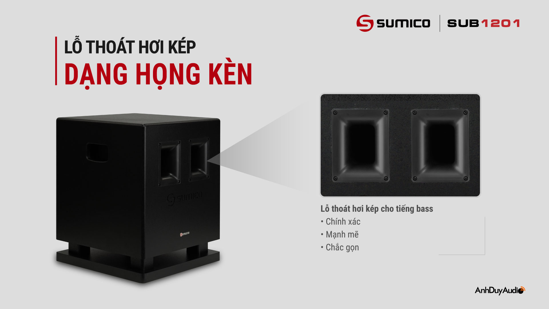 Cổng thoát hơi kép dạng họng kèn nổi bật trên loa siêu trầm Sumico SUB1201 giúp các áp âm cộng hưởng bên trong thùng loa được giải phóng nhanh và không bị hiện tượng hồi tiếp, giảm thiểu tiếng ồn tần số thấp cho tiếng bass chính xác, mạnh mẽ và chắc gọn ngay cả khi loa hoạt động ở cường độ lớn.